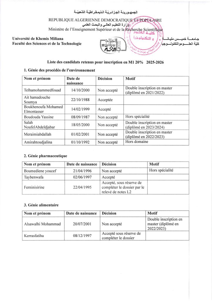 List of ADMITTED candidates for enrollment in Master 1 (20% quota) – Academic Year 2025/2026 / غير مصنف / By webmaster Environmental Process Engineering Pharmaceutical Engineering Food Engineering